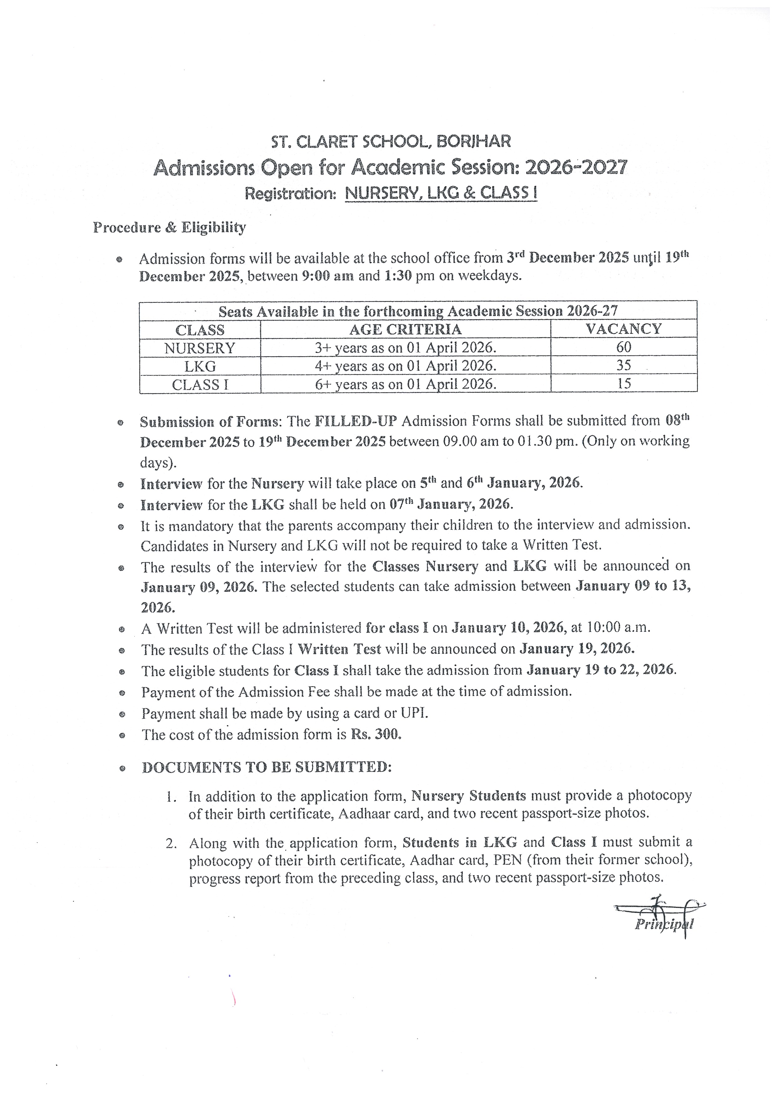 St. Claret (Saint Claret) School located at VIP Borjhar on the side of NH 37 near LGBI Airport was established in 1996 by Claretian Missionaries with the aim of providing a holistic and quality education to the students of the Guwahati Subarbs. The school was upgraded to upper primary, Secondary & senior secondary level eventually.